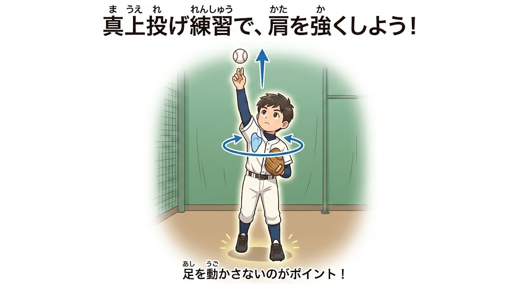 - 足が動かずに真上に投げられたら、それは君の肩が「一番安全で強い動き」ができている証拠だよ。
